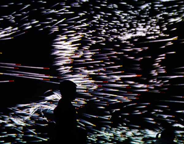 《宇宙共振》,是物理學概念“共振”的全新詮釋。整屏的粒子象征宇宙的能量,人類和宇宙在某些頻段發生共振,平行的粒子會根據體驗者的形體發生偏移而湍流運動,呈現不同的形態。用科技手法把物理概念和細節體現的淋漓盡致,在沉浸式體驗的同時,也了解了“共振”物理知識。